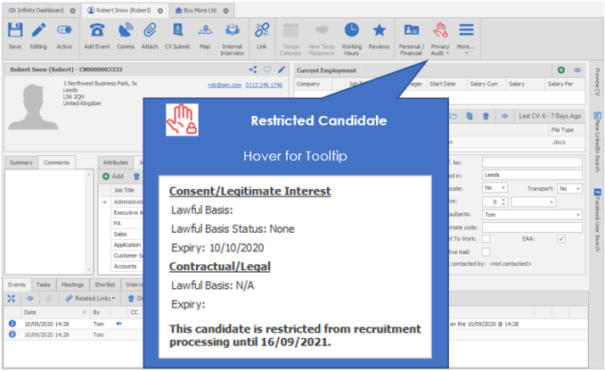A Candidate can be manually restricted, from the candidate page ‘Privacy Audit’ screen