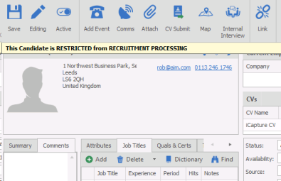 Restricted candidates will not appear in the Jobs Comms Centre and will not allow CV to be submitted
