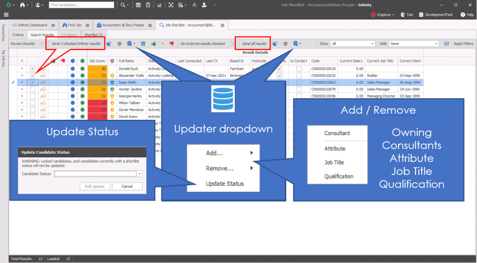 The bulk updater is available within the toolbar in ad hoc candidate / contact and job search results. This facilitates you to update certain content within the records in the candidate or contact list.