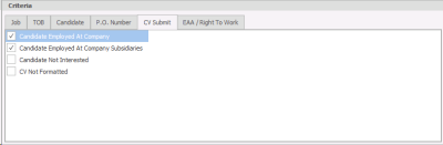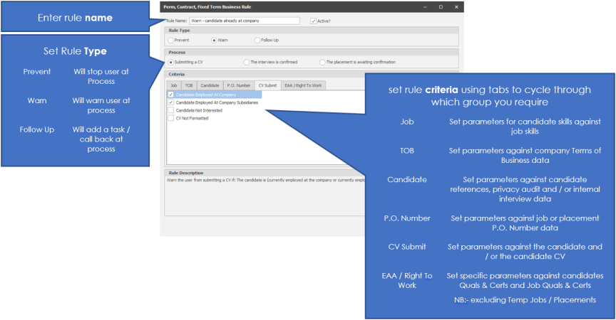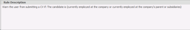 Business Rules can be very simple such as a warning message appearing during the CV Submit process to inform you that a Candidate has not an Internal Interview or that the Terms of Business have not been received from the client.