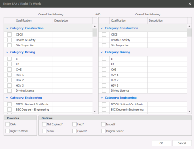 The single option enables you to accept someone who is eligible to work with a single qualification such as an EU Passport. The candidate only needs to match one of the options ticked to be eligible to work.