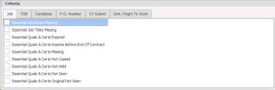 The Job tab contains job related criteria to enable you to build the Business Rule based on Essential Job Titles, Attributes and Quals & Certs which may be missing, expired, not held etc.
