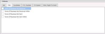 The TOB tab contains TOB related criteria to enable you to build the Business Rule based on the status of Terms of Business activity.