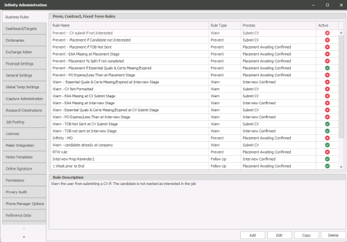 You can also prevent processes within Infinity so that users cannot continue until a Business Rule condition has been met – such as the candidate’s work permit is not valid so you will be unable to confirm a Placement until the condition has been met and the work permit becomes valid.