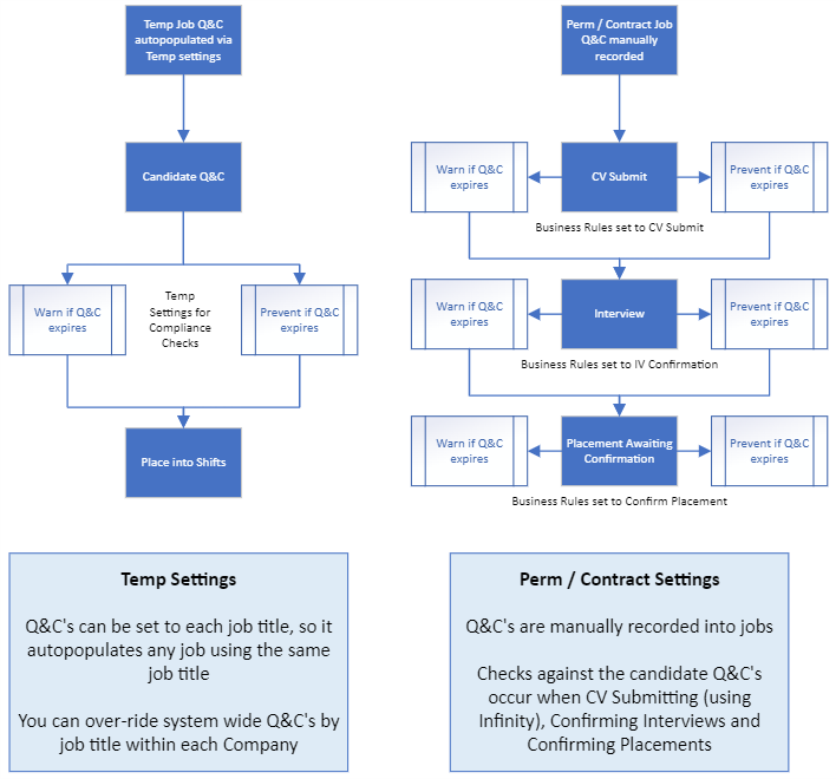Infinity allows you to manage compliance by using Quals & Certs which can be recorded within Job records, for Temp jobs these can be automatically populated from Job Title defaults setup in Temp settings, if you require to have specific requirements by Company these can be setup in Company records. For Perm / Contract / Fixed Term Jobs you should record job specific quals & certs manually into jobs or use copy job.