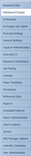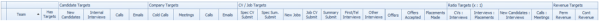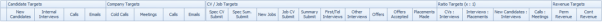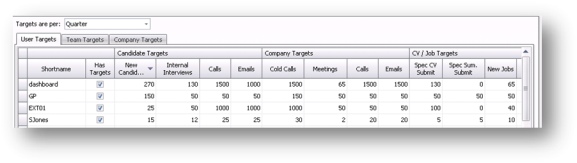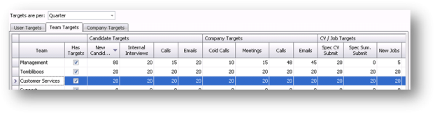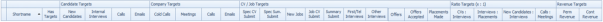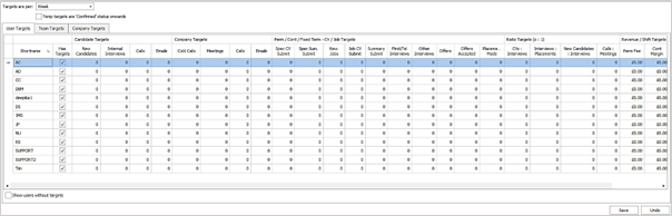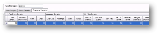 Within each tab; User, Team, Company, there are Target types. Each Target type relates to Candidate, Company, Perm/Cont/Fixed Termm CV/Job, Ratio or Revenue / Shifts Targets.