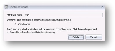 - If you do delete any Attributes then a delete confirmation screen will appear with details of where the Attribute is being used. By deleting the Attribute in the Dictionary you will also remove it from any Attribute grids within Infinity.