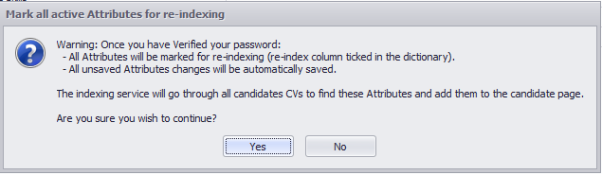 You are able to re-index (auto skill) an attribute by ticking then Re-Index box against the appropriate attribute. The indexing service runs regularly throughout the day, usually every 60 minutes, once it has run it will check any attribute marked for re-indexing against all candidate CV’s and assign the attribute to those it finds with the attribute.
