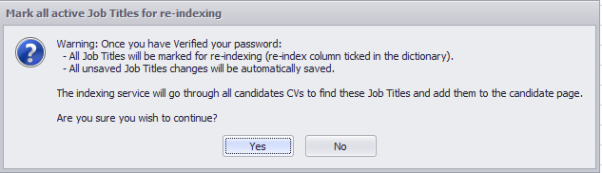 You are able to re-index (auto skill) a job title by ticking then Re-Index box against the appropriate Job Title. The indexing service runs regularly throughout the day, usually every 60 minutes, once it has run it will check any Job Title marked for re-indexing against all candidate CV’s and assign the Job Title to those it finds with the Job Title.