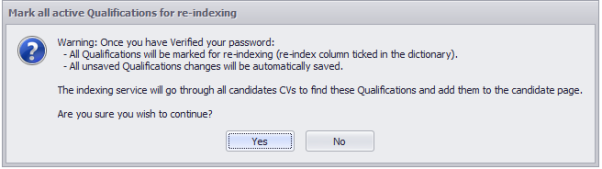 Re-index All Quals & Certs – mark all Quals & Certs to be re-indexed – once confirmed it will then assign Quals and Certs when the Qual & Cert or synonym is found within the CV |
