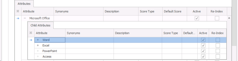 Child Attributes are created in exactly the same way as Attributes and can have Synonyms, Score Types and Default Scores associated with them.