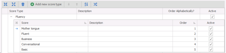 - Score Types can add a further dimension to your Attributes each Attribute can be assigned a Score Type to give further Search Criteria options. For example against languages