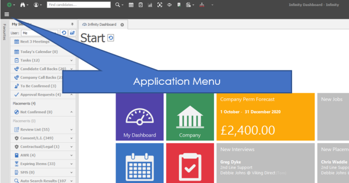 Infinity Administration is launched via the application menu which is accessed via the "hamburger" button in the top left corner of Infinity: