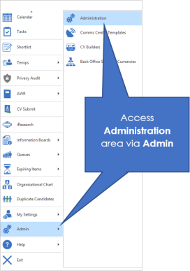 - Application menu, Admin and select Administration (see image to the left)