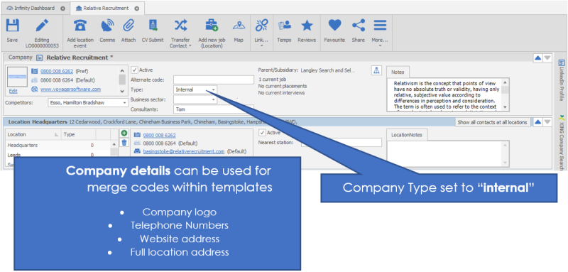 We recommend one of your first tasks is to add your business in Infinity as an Internal Company as this will provide you with key data to use when building master templates in the Comms Centre.