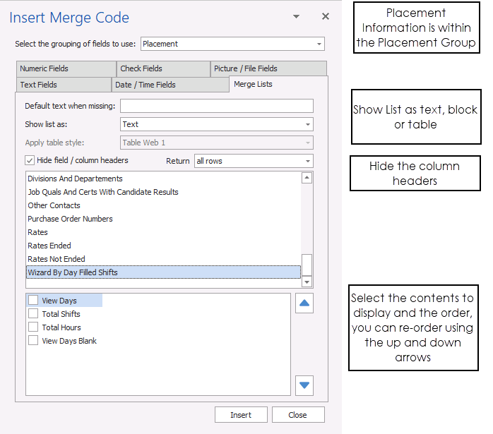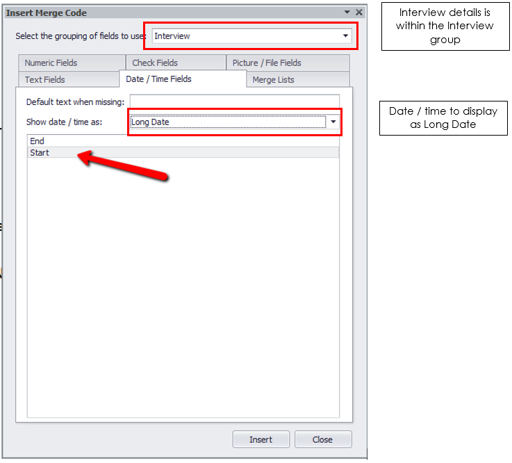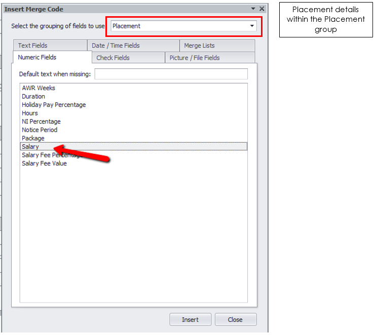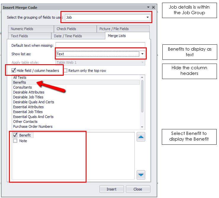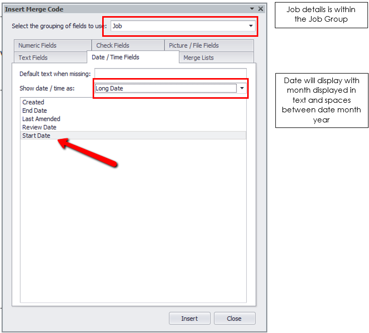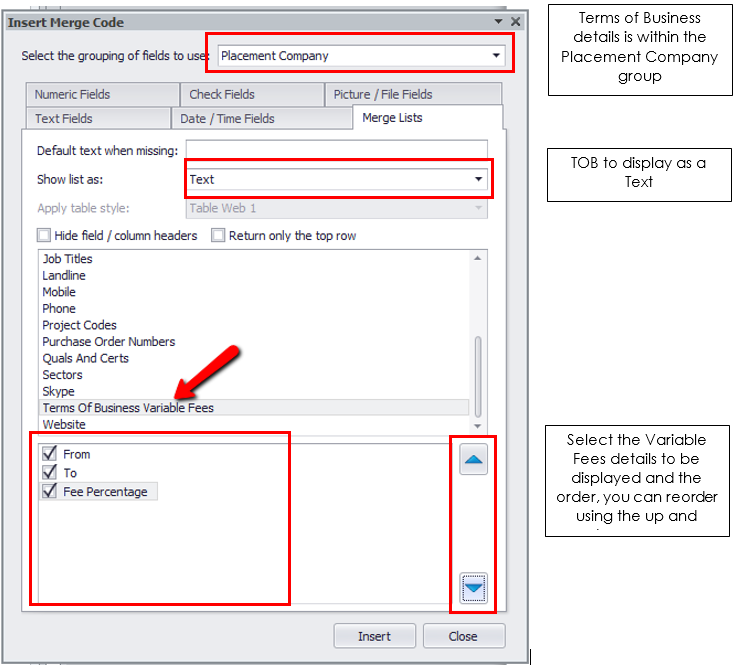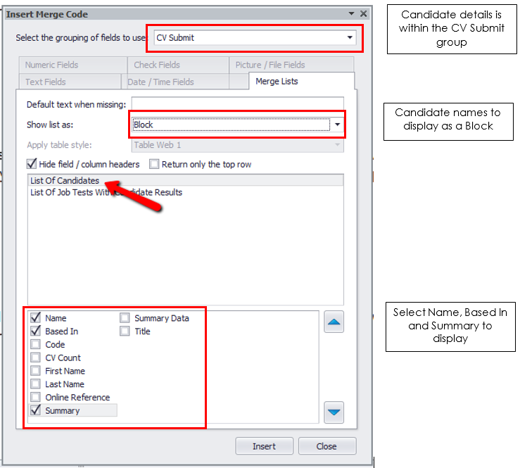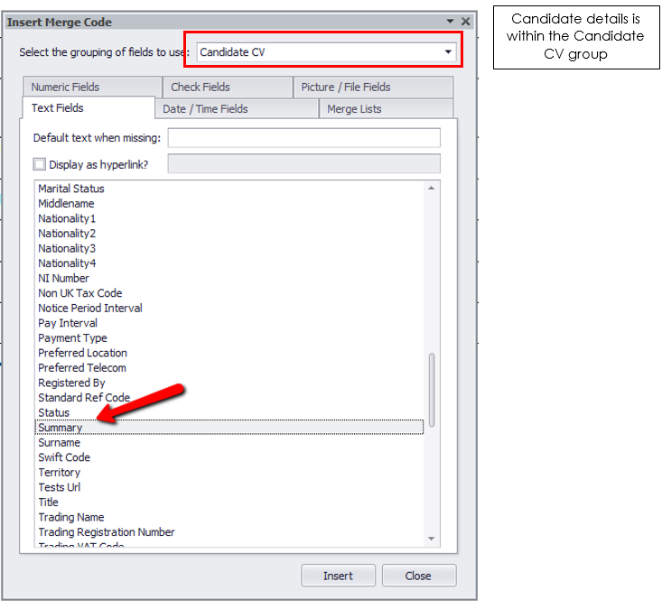 NB:- If using bullet points within summary fields then use SUMMARY DATA merge code