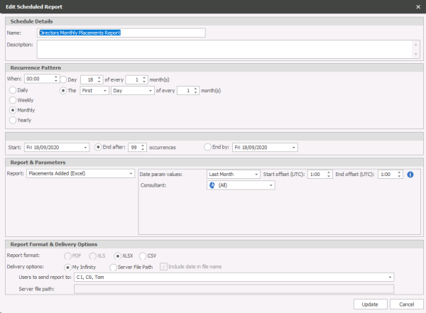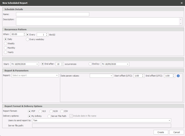 Infinity’s Reports can be schedule to run automatically using Scheduled Reports this can be utilised to have reports running automatically and can be a good alternative to giving access to reports or just a quick way to have reports created without any need to set parameters manually. The report can be sent to user(s) My Infinity panel where they can Save, copy and open the file to view. Alternatively it can be set to automatically save the report to a file location (the file location needs to be available on the SQL server as well as the user).