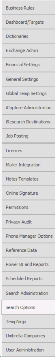 Search Options controls the Text search facility within Infinity Search. The options determine the searching of documents such as CVs, Attachments and other Mailbox and Folder Pools.