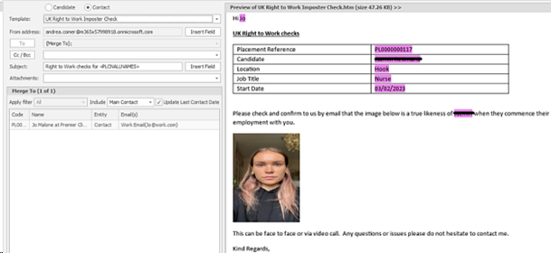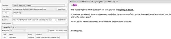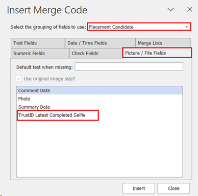 The latest candidate’s TrustID Selfie photo stored in the attachments area can be merged in candidate related Comms Centres templates