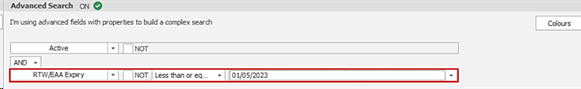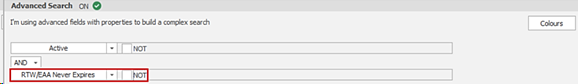 - If the ‘NOT’ operand is used the search returns candidates with an RTW/EAA Never Expires? field that is un-ticked
