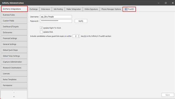 The username and password for the account provided by Ikiru People can be entered and verified in this screen. This will enable the integration on the Infinity database