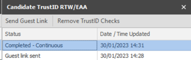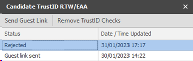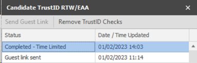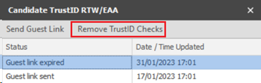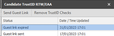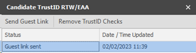 Note: Guest Links can be repeatedly sent to a candidate. This may be required if sent to the wrong email address or candidate did not receive / has deleted the email for example. A new Guest Link will be created each time, with the latest showing in the status history, but the old Guest Links will still be active and be included in Infinity reminders. It is therefore recommended that ‘Remove Trustid Checks’ is done immediately before sending another Guest Link when the candidate is currently at ‘Guest Link Sent’ status