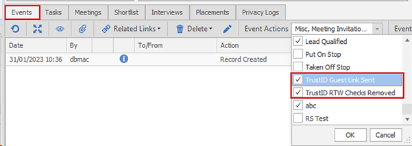 Note: users must add the new TrustID system event actions to their candidate page event filter to see the events