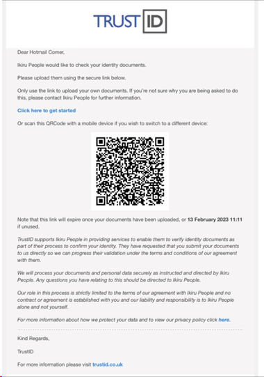 The TrustID Guest Link is an email that gets sent from ‘cloud@trustid.co.uk’ asking the candidate to upload their identity documents using their mobile phone. Sending Guest Links does not incur any charges