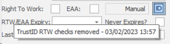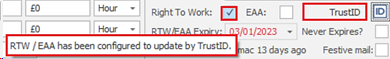 The control of the RTW/EAA fields passes to TrustID. The control field shows a value of ‘TrustID’, the RTW/EAA fields are non-editable and can only be updated by the TrustID service. There is a tooltip on all of the RTW/EAA fields that says ‘RTW/EAA has been configured to update by TrustID'