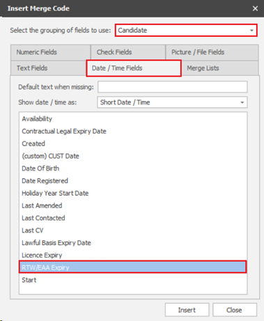 The candidate RTW/EAA Expiry Date field is available to merge in your candidate related Comm Centre templates