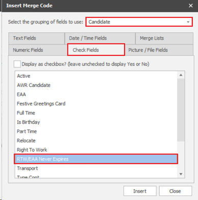 The candidate RTW/EAA Never Expires? field is available to merge in your candidate related Comm Centre templates