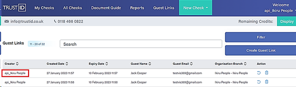 Guest Links sent from Infinity will be visible in the Guest Link area on the customer’s TrustID account