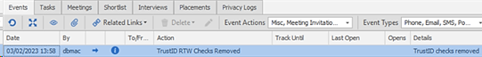 - An info event is logged for that user with the event action of ‘TrustID RTW Checks removed’ and the event cannot be deleted