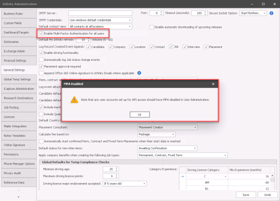 When ticked a warning is given that user accounts used for API access should have their MFA disabled. There is a setting in User Administration / Edit User screen to disable/override the global setting for that user