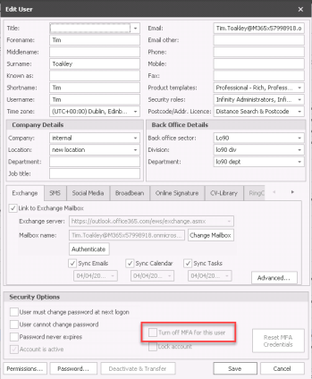 If all Infinity administrator accounts are unable to authenticate and log in to Infinity then please contact our technical support team who will be able to disable MFA on the database for you. This is the Drop-down text)