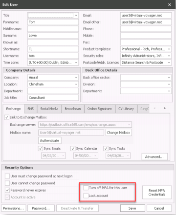 Infinity users are created and managed via User Administration (including Exchange Sync settings and integration credentials)