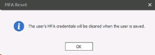 If the credentials are reset the user will need to scan the QR Code and set up their device again when they next log in. Credentials can also be reset by clicking on the ‘Reset MFA Credentials’ button. Resetting credentials should also be used if the user loses their device for example. Once reset the users is given the following notification