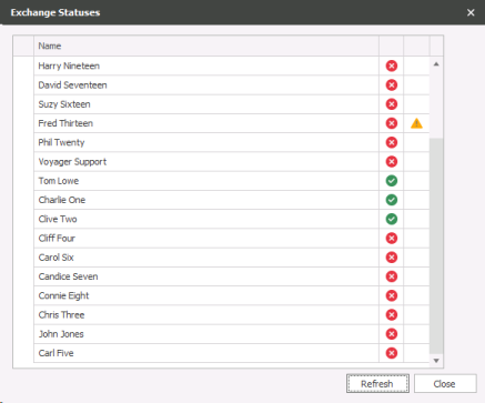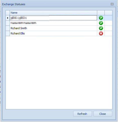 A cross in this column means that Exchange Sync is not working. This could be for various reasons including no internet access and the Exchange server being down. If Exchange Sync fails, Infinity will continue to try to communicate with the Exchange server.