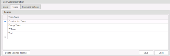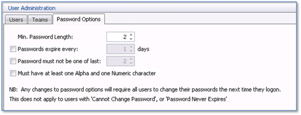 The User Administration screen is divided into three areas; Users – a list of existing Users, Teams – a list of existing Teams and associated members and Password Options – various password configuration settings.