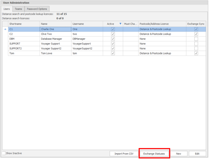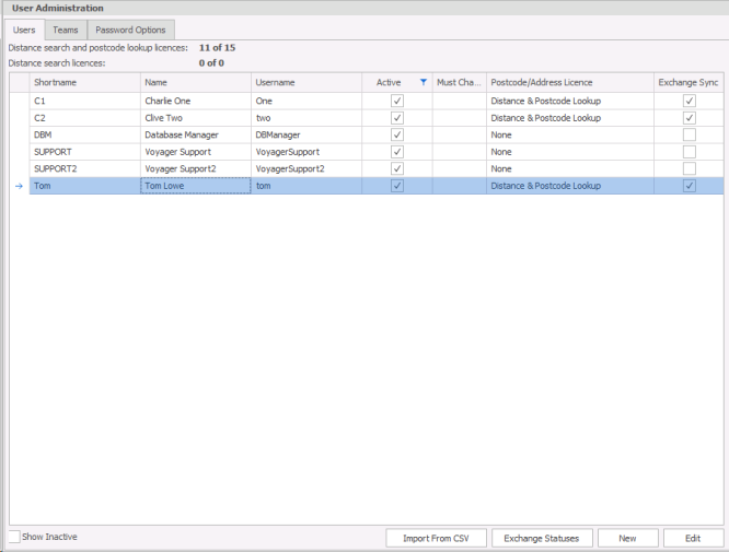 All ‘Active’ users are listed here with their key details, if you have Distance Search and / or Distance Search & Address Lookup licences it will also show which users have been assigned a licence. It will also indicate whether Exchange Sync is active.