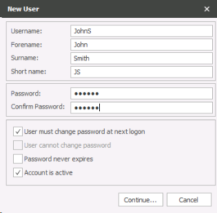 Complete the New User screen and select Continue to proceed to complete the User details.