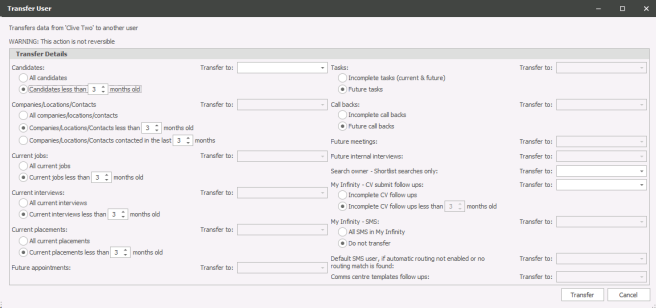 Each record that includes a field for Consultant is available here so that you can transfer any records that have the previous users name against, transferred to an alternative user. If any of these dropdown choices are left blank then it will assume that no action is necessary and the previous users name will still show within these records.