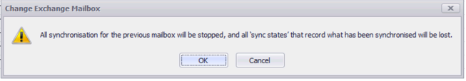 • You are warned that all synchronisation on the previous mailbox will be stopped, and synchronisation on the new mailbox will start.