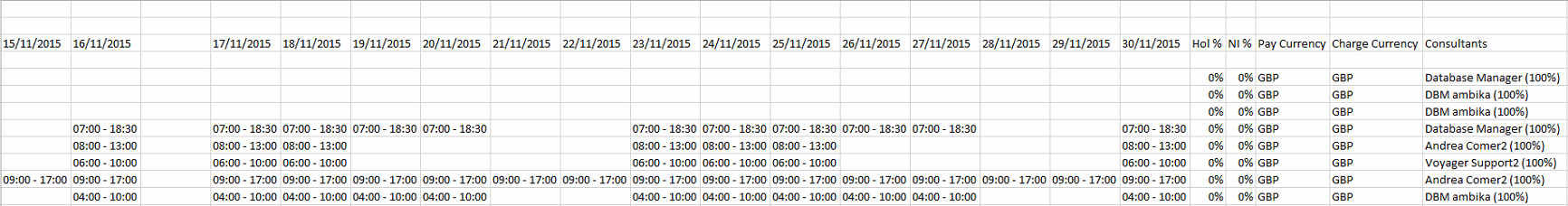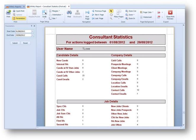 Parameters available - From and To dates, Consultant (All, Team, individuals)