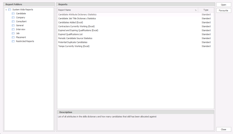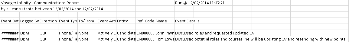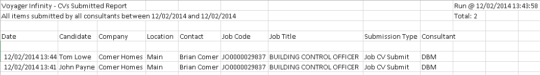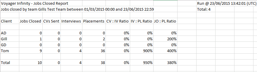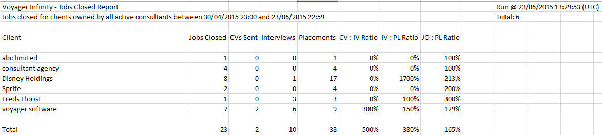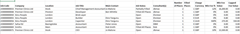 Jobs that are closed within the date range and includes statistics on CVs, interviews and placements (which are not filtered by the date range). The Excel file will open with two tabs one for jobs closed by consultant and one by companies closed jobs (collated statistics)