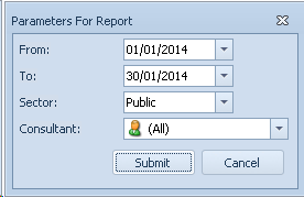 Parameters available – From and To dates, Sector (Public only), Consultant (All, Team, individuals)