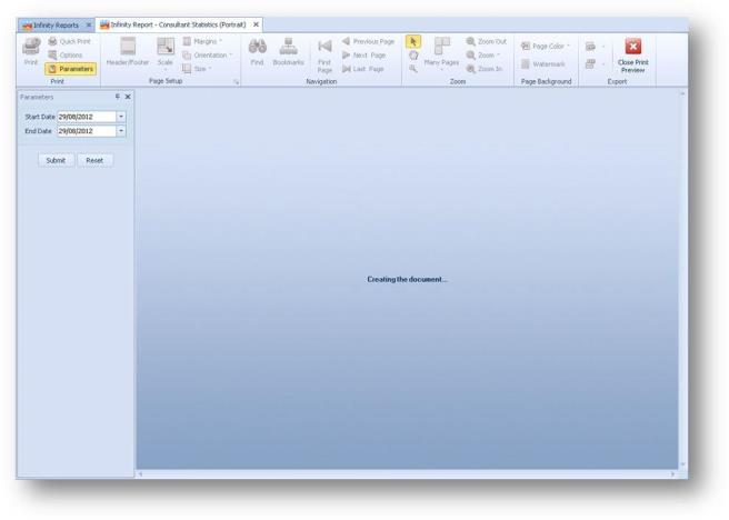 You will see the Parameters panel on the left hand side, where you will be given parameters you can set, some reports will require start and end dates, consultant name / ALL / Team name and any other specific parameter required appropriate for the report you are creating. Enter the parameters and then click on Submit
