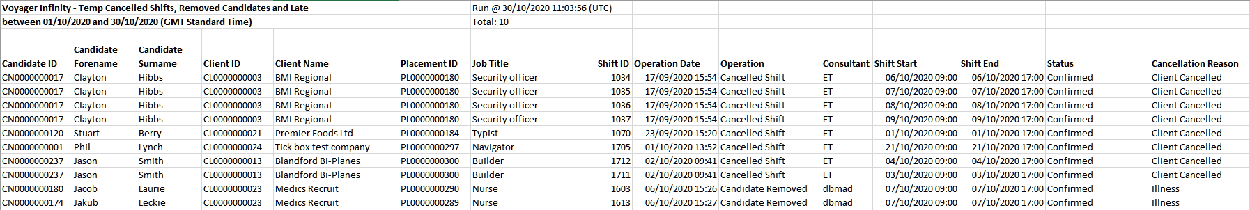 Allows you to review any cancelled shifts, including removed candidates and late logs within a date range
