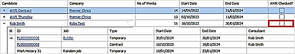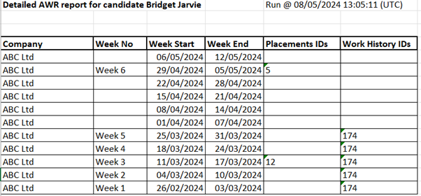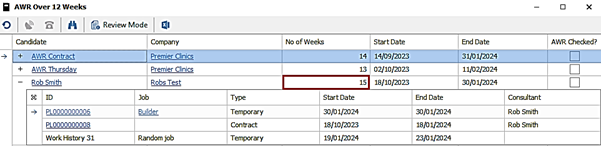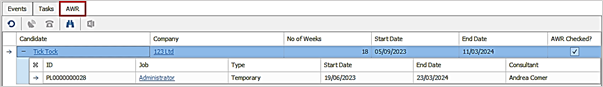 - Shows all AWR Clocks a candidate is in as per the AWR Tab and details of each counted week in that clock, is shown on a row