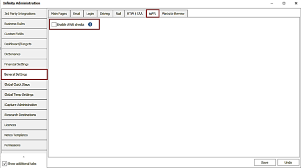 Infinity AWR compliance checking is optional and is configured in the Administration / General Settings / AWR tab.